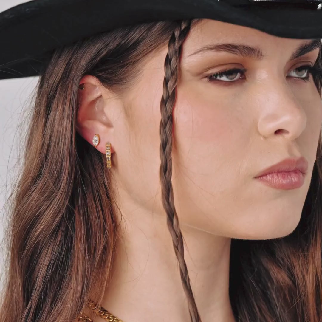Add a touch of vintage charm to your look with our Vesper Huggie Hoop Earrings. Inset with sparkling square crystals, these bold hoops will elevate any outfit with a classic yet glamorous touch. Perfect for any occasion!
