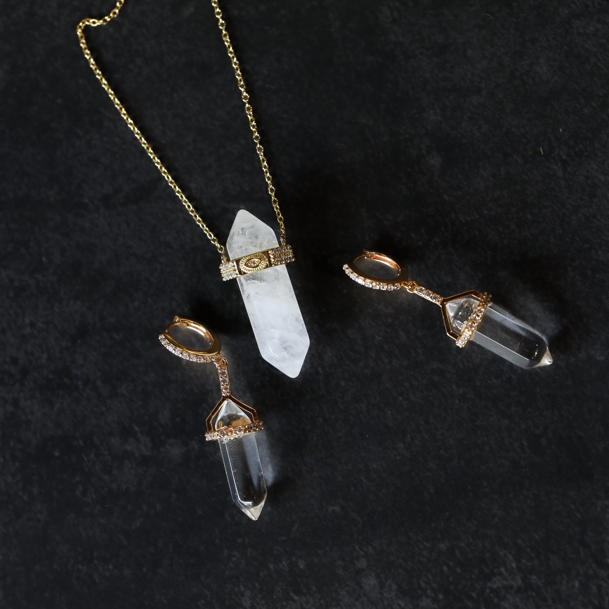 - Clear Quartz crystal necklace detailed with an evil eye