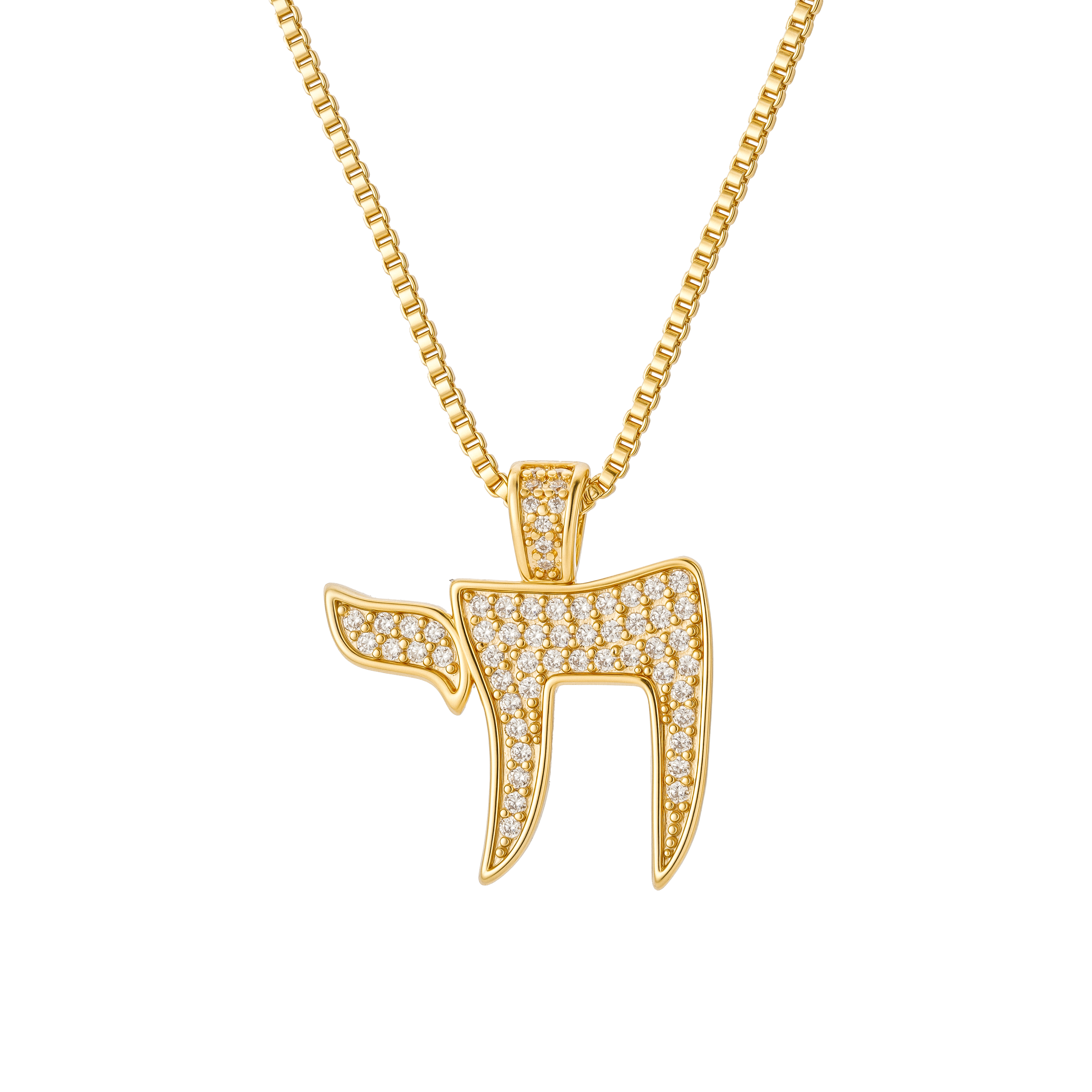 This stunning piece features the Hebrew word Chai—symbolizing "Life"—rendered in a bold, contemporary typeface. The entire silhouette is meticulously pavé-set with shiny stones, catching the light from every angle to create a continuous shimmer.
