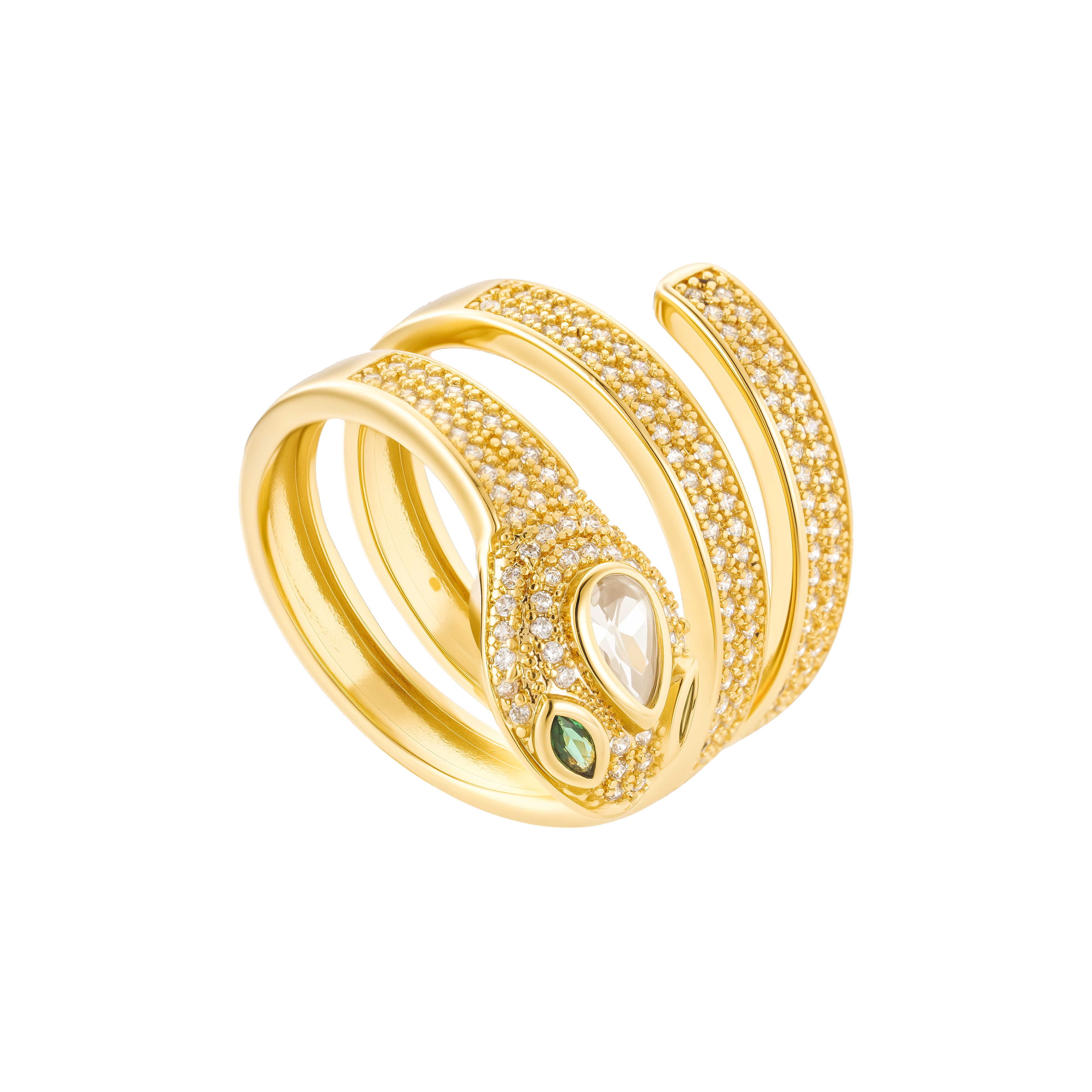 The Serpent Desire Ring coils effortlessly around your finger, dripping in high-shine gold and pavé sparkle. Inspired by temptation and transformation, this statement piece features a sculptural wrap silhouette accented with a luminous pear-shaped stone and a subtle green gem detail—because power is always in the details.