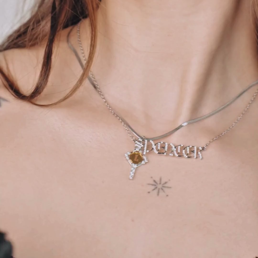 - Custom engraved key pendant necklace detailed with crystals