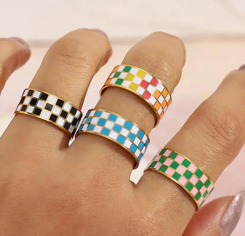 This Checkered Ring adds an eye-catching modern touch to any look. Its trendy design and stackable style make it the perfect accessory for everyday wear. Its durable construction and light weight make it comfortable to wear while still making a statement.