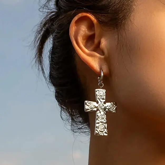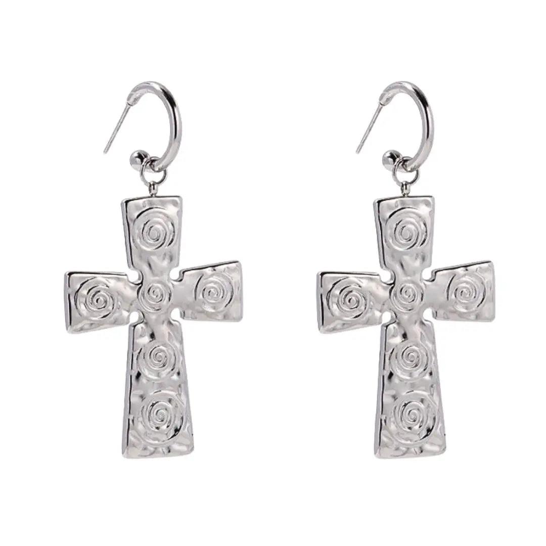 Enhance your style with our Silver Swirl Cross Earrings. The intricate swirl design on the large silver cross pendants adds a touch of elegance to any outfit. Crafted with expertise, these earrings are a must-have for any wardrobne.