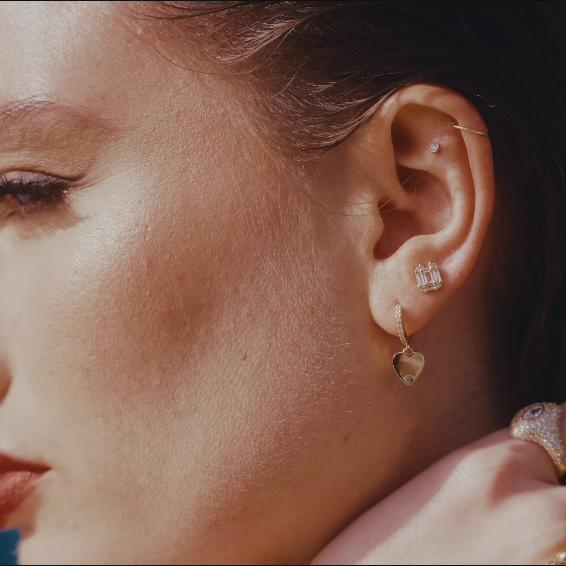 - Mini huggie hoop earrings with a dangle heart charm detailed with a crystal